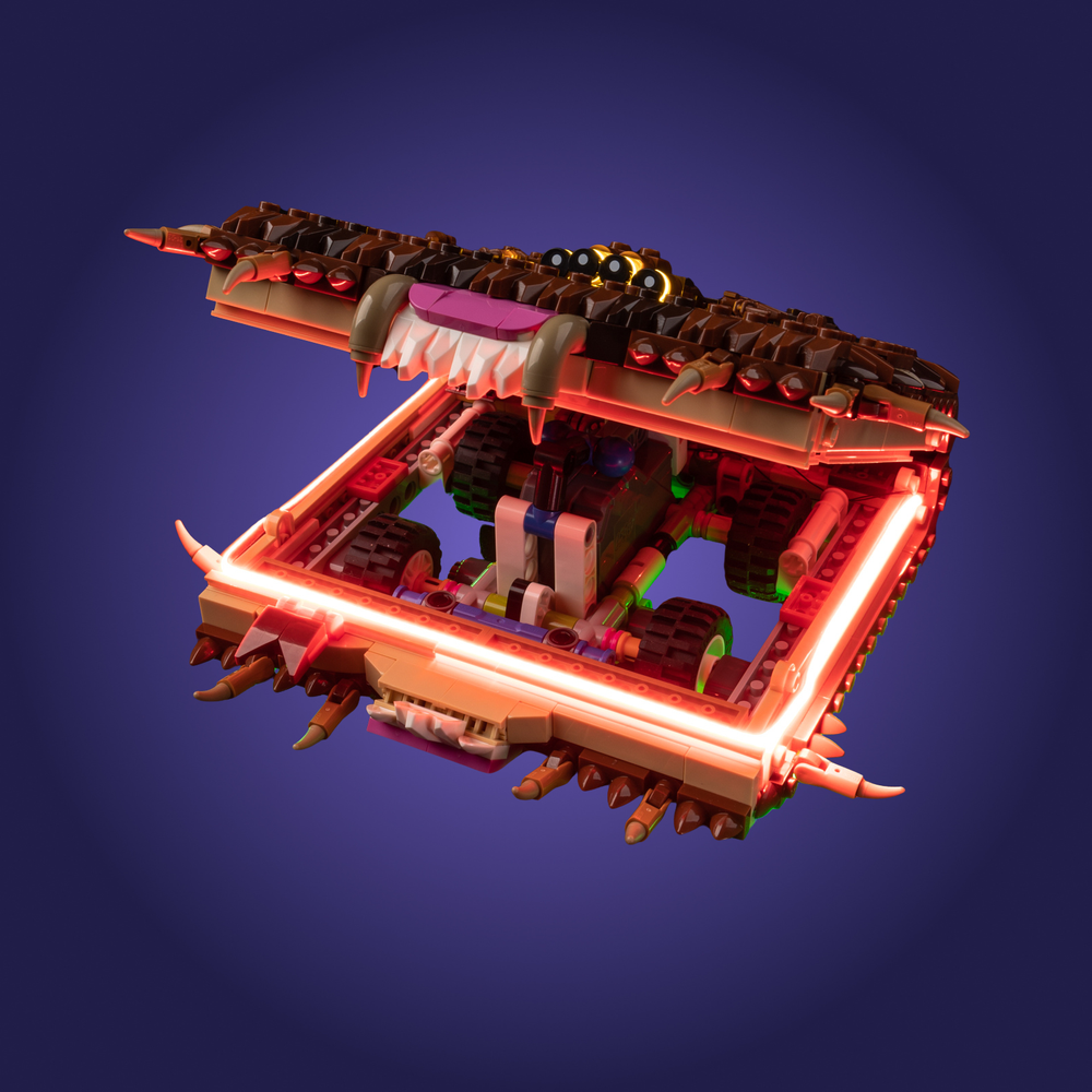 As the jaws snap and the wheels roll, reflections from the lights amplify the motion, turning every sprint into a magical chase scene.