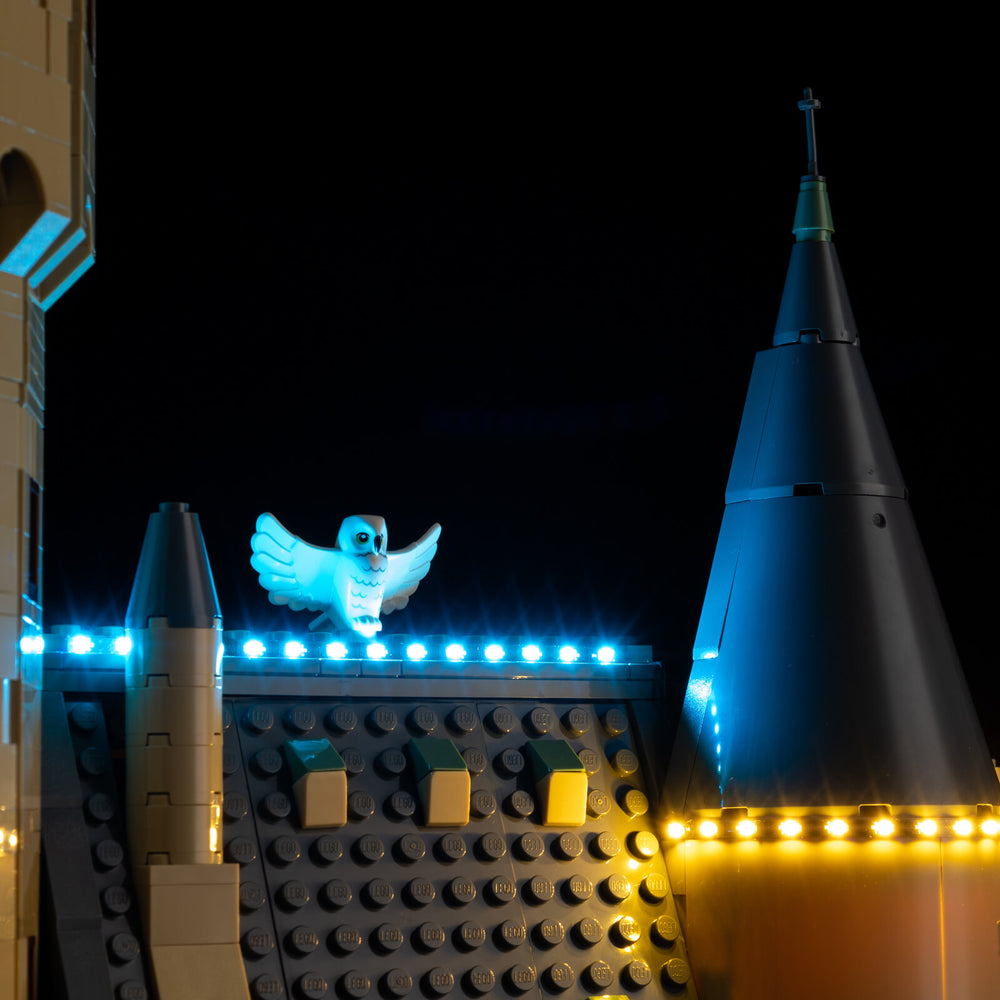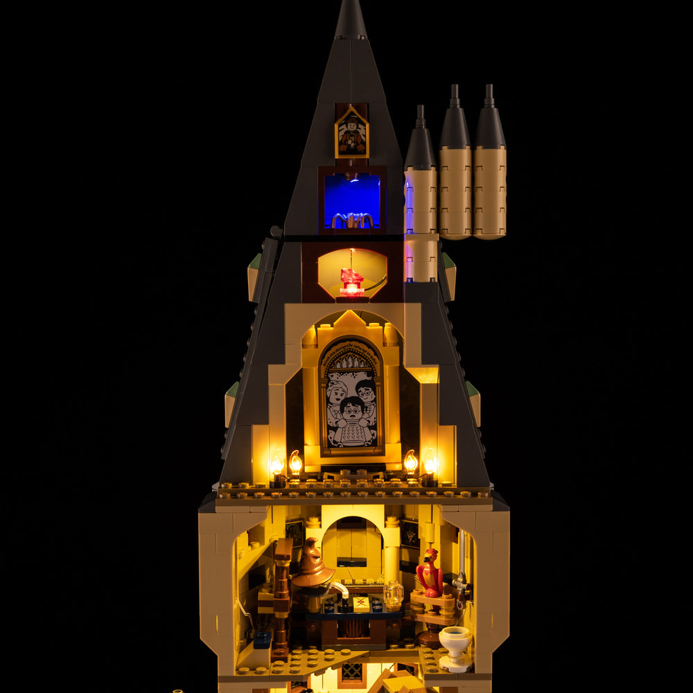 Enhance Hogwarts Castle: The Main Tower 76454 with enchanting lighting that brings iconic scenes to life, from the shifting Grand Staircase to the secret trapdoor guarded by Fluffy.