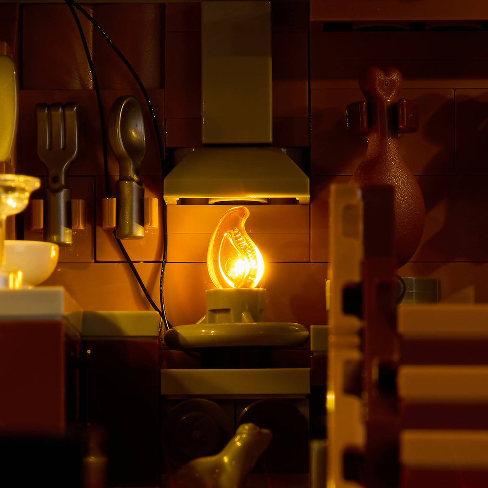 Includes 11 minifigures—Jabba the Hutt, Princess Leia, C-3PO, Bib Fortuna, R2-D2 with bar table, and more. Gentle lighting makes every character pop with personality and nostalgia.