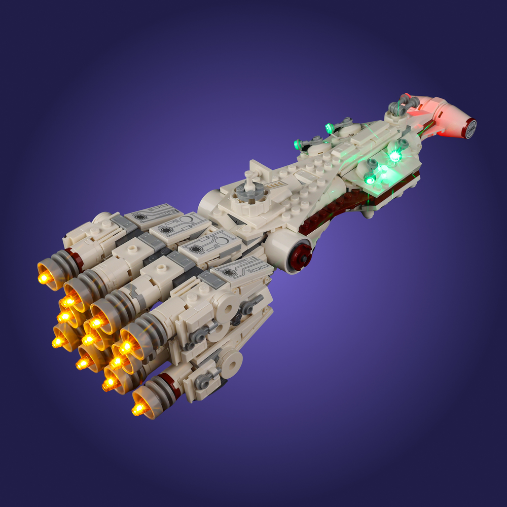 Embark on a cosmic build. Our lighting kit turns the mid-scale Tantive IV into a luminous tribute to the opening of A New Hope—engine glow, hull accents, and cinematic shadows that rekindle Star Wars awe.