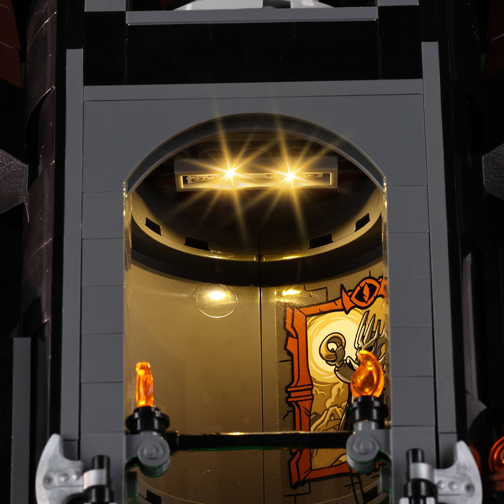 Enter Middle-earth. Our lighting kit turns the Dark Tower into a dramatic centerpiece—torches flicker, spotlights rotate, and the Sauron crystal orbs on the 3rd floor power on when you open the drawer for a touch of real magic.